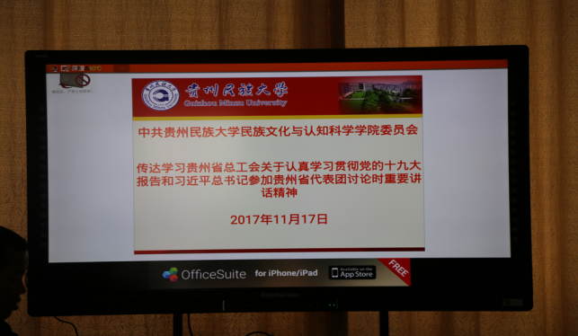 2017年11月17日14:00,中共贵州民族大学民族文化与认知科学学院委员会在15栋教学楼1005会议室组织教职员工学习“传达学习贵州省总工会关于认真学习贯彻党的十九大报告和习近平总书记参加贵州省代表团讨论时重要讲话精神”。学院院长蔡曙山教授,副院长杜薇教授及教职员工参加了本次学习活动,学院党委书记夏大文博士主持学习。